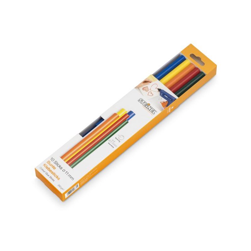 200 g bastoncini a colori Ø 11 mm. Materiale adesivo hot fuso caldo di alta qualità. Per artigianato e decorazione. Contenuto: 2 x giallo, 2 x arancione, 2 x rosso, 2 x blu e 2 x verde