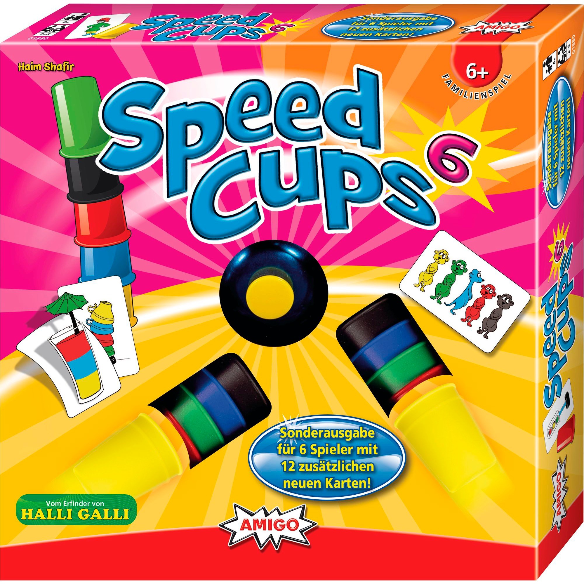 In "Speed Cups 6" ogni giocatore riceve 5 coppe colorate. Le carte e la campanella sono poste al centro del tavolo. Le carte determinano se le tazze sono disposte una accanto all''altra o una sopra l''altra. In quale ordine i palloncini salgono verso il cielo? Se le coppe sono state disposte correttamente, premi rapidamente la campana e prendi la carta - perché vince il giocatore con il maggior numero di carte! Questa edizione speciale è adatta per un massimo di 6 giocatori e include 12 nuove carte azione.