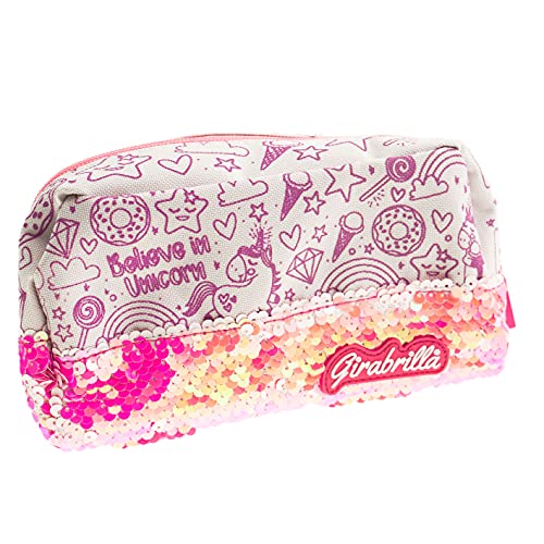 DESIGN SCINTILLANTE: l'astuccio Girabrilla Unicorno Color Me è realizzato in tessuto bianco con rifiniture e cerniera in rosa. Decorato con paillettes reversibili glitterate di diversi colori, è dotato di un set di 6 pennarelli viola, azzurro, giallo, verde, magenta, arancio che possono essere riposti all'interno della custodia, assieme ad altri kit di materiali scolastici come penne, matite, gomme, righelli.