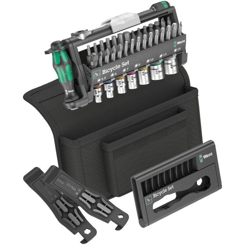 Set compatto di attrezzi per bicicletta 38 pezzi in una borsa per officina ed escursioni Con una piccola custodia morbida per portare con sé i singoli utensili Include l'utensile per rivettare decatena e lucchetto decatena con rivetto intercambiabile per aprire e chiudere decatene da moto. Adatto per catene da una velocità una singola velocità fino a 12 velocità. Attrezzi per i più popolari profili di bici da strada, mountain bike e e-bike Include due leve di pneumatici con caratteristiche aggiuntive