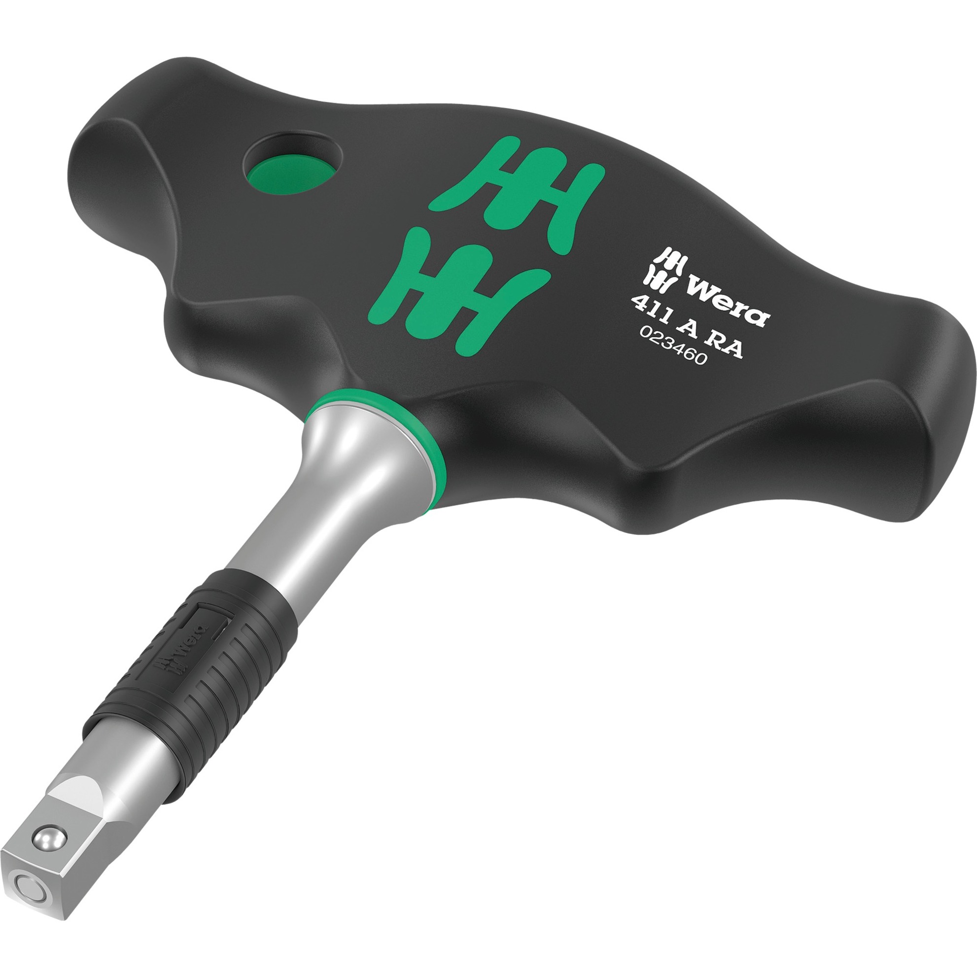 Il cacciavite adattatore a manico incrociato 411 A RA di Wera è adatto per dadi plug-in con azionamento da 1/4". Gli inserti della chiave a bussola sono bloccati saldamente dalla palla. Il cricchetto di cambio integrato con dentatura fine e un angolo di ritorno di 4,5° semplifica e accelera l''avvitamento senza noiosi riposizionamenti. Il meccanismo a cricchetto del cacciavite adattatore a manico incrociato 411 A RA è completamente incorporato nell''impugnatura. La direzione di avvitamento può essere facilmente modificata tramite la leva di commutazione. Con il manicotto a rotazione rapida sulla lama, l''utensile può essere guidato in modo sicuro durante la lavorazione dell''avvitamento. L''impugnatura ergonomica a 2 componenti con forma di presa ideale consente la trasmissione di coppie di serraggio e dissoluzione particolarmente elevate. La forma del manico riempie bene il palmo della mano, le dita giacciono saldamente nelle impugnature incassate morbidamente arrotondate. L''intera mano trova il contatto con l''impugnatura e si evitano perdite di attrito tra mano e maniglia.
