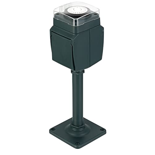 Con timer meccanico. Controllo di entrambe le lattine contemporaneamente. Grazie al colore verde scuro e nero, questa presa per esterni si fonde quasi con l'ambiente circostante