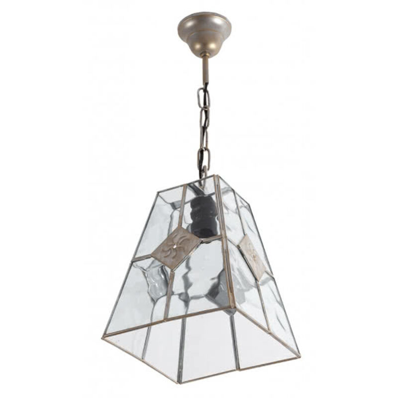 Sospensione a soffitto della serie ESTEPA realizzata in metallo color oro e vetro grezzo. Con rosone tondo a forma di cono da fissare al soffitto e da cui pende una catena in metallo, regolabile da 43 a 82 centimetri di lunghezza. Il suo peso netto è di 1480 grammi, è largo e profondo 20 centimetri e contiene un portalampada E27.