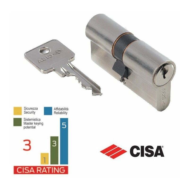 CISA 08710 CILINDRI A PROFILO EUROPEO A DOPPIO CILINDRO SAGOMATO ANTITRAPANO Cilindro Cisa 08710 europeo corpo in ottone, camma DIN, antistrappo. fornito con 3 chiavi Caratteristiche tecniche: Corpo in ottone Cilindretti in ottone Perni: in bronzo antiusura in acciaio carbonitrurato in prima posizione Controperni: in ottone cilindrici e a fungo antigrimaldello in acciaio carbonitrurato in prima posizione Molle in bronzo fosforoso Camma DIN, sporgente, in acciaio sinterizzato autolubrificante Chiavi in ottone, nichelate Dotazione: 3 chiavi Vite di fissaggio. Caratteristiche tecniche: • Corpo in ottone • Cilindretti in ottone • Perni: -in bronzo antiusura -in acciaio carbonitrurato in prima posizione • Controperni: -in ottone cilindrici e a fungo antigrimaldello -in acciaio carbonitrurato in prima posizione • Molle in bronzo fosforoso • Camma DIN, sporgente, in acciaio sinterizzato autolubrificante • Chiavi in ottone, nichelate Dotazione: • 3 chiavi • Vite di fissaggio Finiture