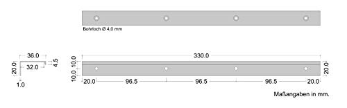 Lunghezza totale: 330 mm - Larghezza 36 mm - Distanza tra i fori: 290 mm - Maniglia profilata con 2 fori per avvitare - Maniglia per porta pieghevole con altezza: 20 mm.