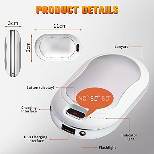 10000mAh Scaldamani Ricaricabile USB, Larkotech Portatile Scaldamani Portatile Power Bank Hand Warmer con Display a LED torcia elettrica Modalità massaggio per Campeggio, Sci, Regali (bianco)