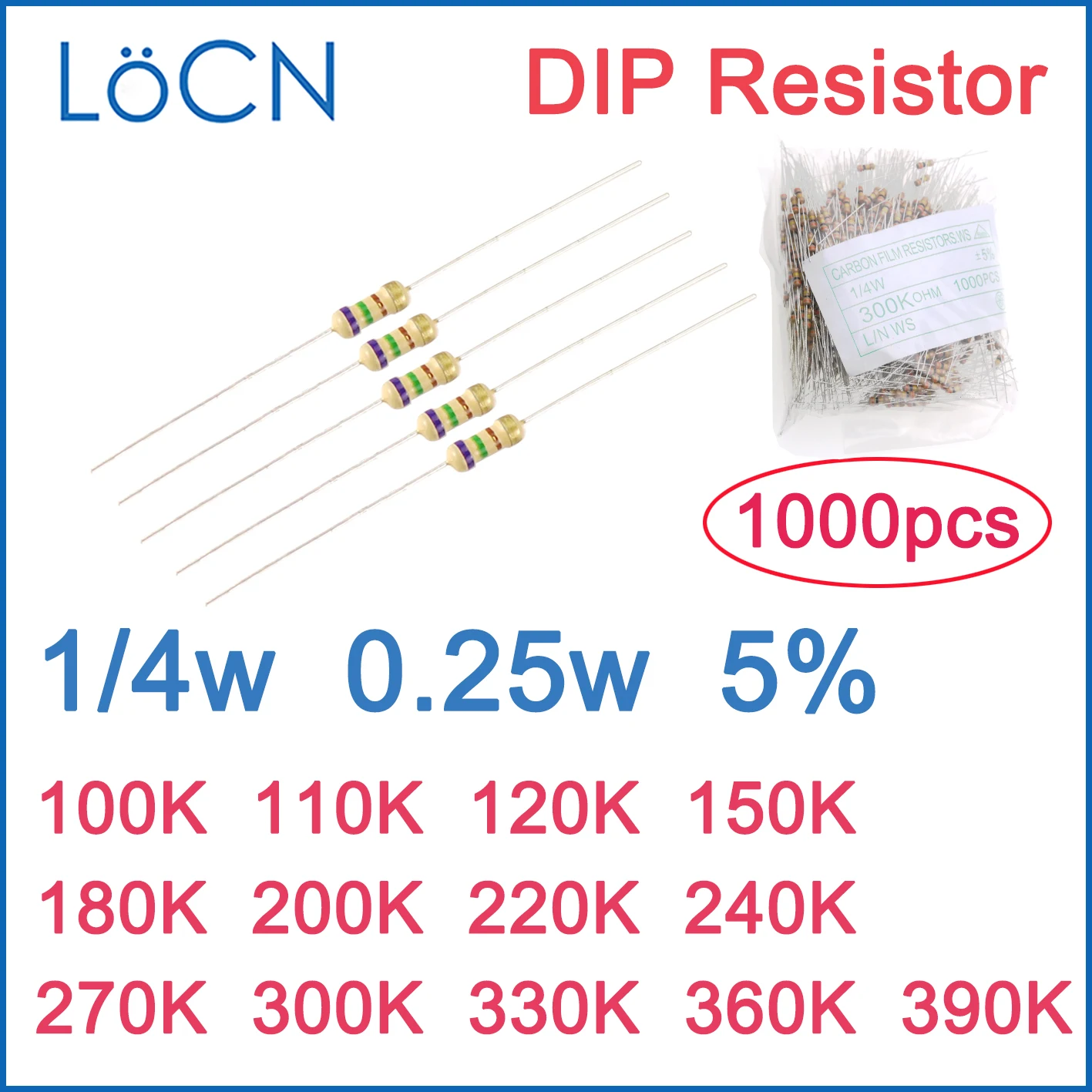 1000pcs 5% 1/4W Carbon Film Resistor DIP 100K 110K 120K 150K 180K 200K 220K 240K 270K 300K 330K 360K 390K OHM Color ring 0.25w