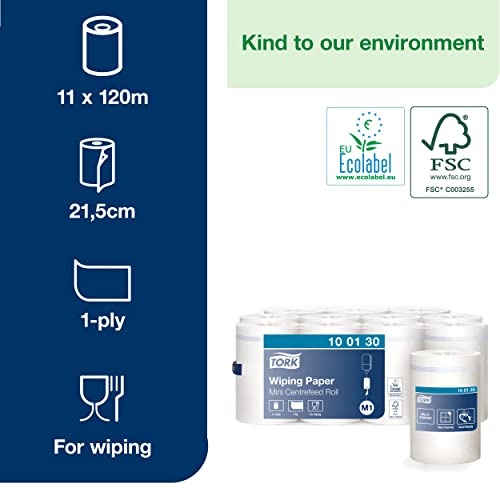 Tork 100130 Carta per asciugatura Advanced, compatibile con sistema M1 (ad estrazione centrale mini), 1 velo, 1 x 11 rotoli (11 x 120 m), bianco