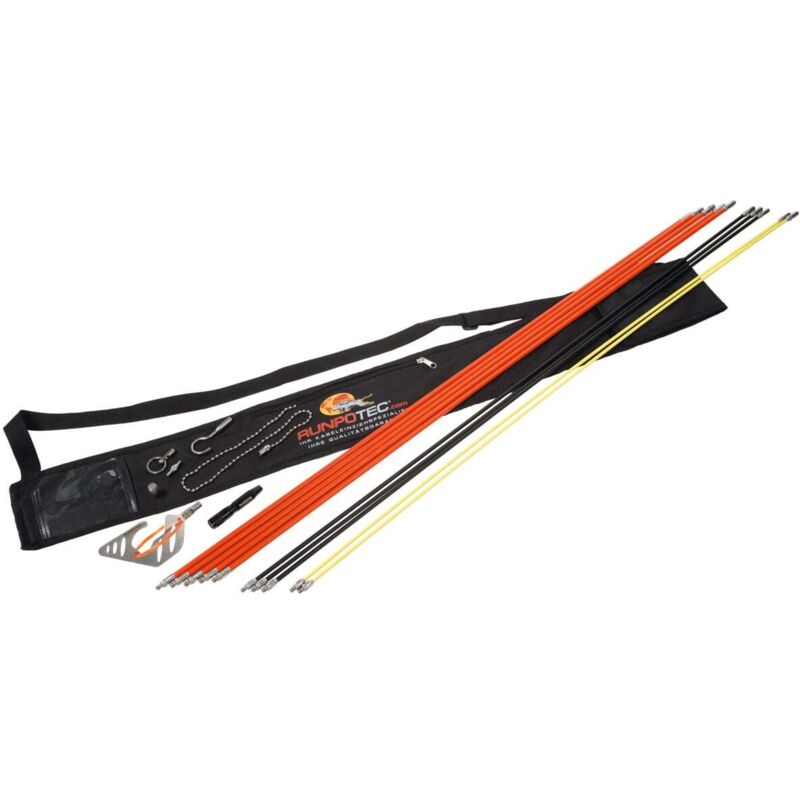 Descrizione La nuova tecnologia basalto consente raggi di curvatura estremi, ma le barre rimangono molto indeformabili. Tutti i collegamenti hanno una filettatura RUNPOTEC RTG da 6 mm e nessun bordo antiurto o transizioni filettate. Il magnete può contenere oggetti fino a 2,5 kg. La catena a sfere consente in combinazione con il magnete un luogo mirato o di guidare verso pareti e aperture del muro. Inoltre, nel pacchetto Comfort è incluso lo speciale gancio scorrevole che, grazie alla funzione di inclinazione, può superare facilmente ostacoli fino a 6,5 cm di altezza. La lampada LED antiurto inclusa ha una luminosità molto elevata e una durata estremamente lunga grazie alle batterie AAA Duracell. Nella pratica custodia con tracolla, tutti gli accessori possono essere riposti perfettamente. Ottimale campo di applicazione: controsoffitti, canaline per cavi, pareti cave, cablaggio post cablaggio in caso di cavi non guidati, vani sottosuolo, vari passaggi e molto altro ancora. La