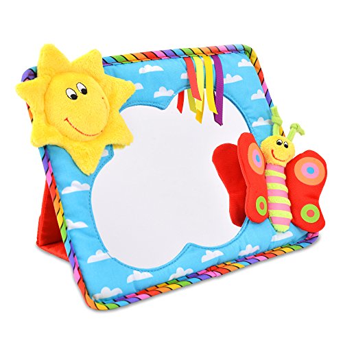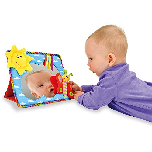 Uno specchio per bambini in plastica con una cornice morbida e texture e suoni da esplorare