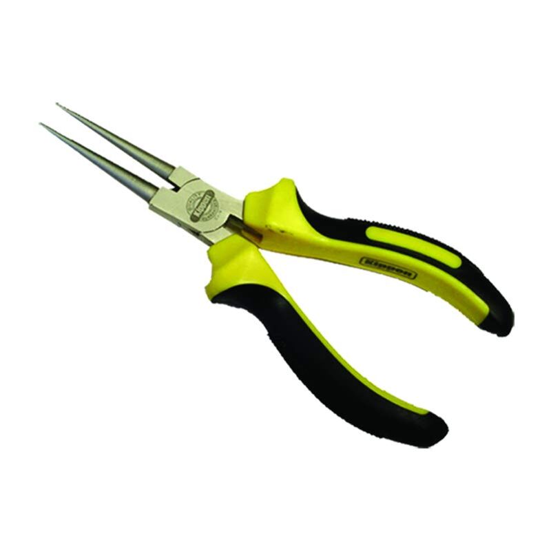 Pinza a becchi tondi semi professionale 150 mm. Corpo e testa in acciaio al chrom vanadium con finitura al nickel e impugnatura in materiale bicomponente.