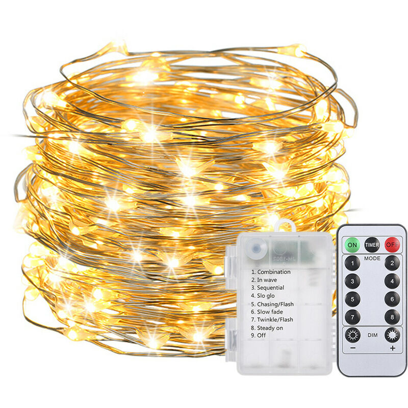 Questa splendida luce a fili di fata da 10 metri/32,8 piedi 100 LED con mini telecomando a 13 tasti porta i tuoi ricordi indimenticabili e ti offre un'atmosfera calda e gioiosa. Che cosa state aspettando? Acquista e divertiti. Caratteristiche: La lunghezza totale della stringa di luce è fino a 32,8 piedi con 100 LED superbi per la protezione degli occhi, può coprire un'ampia area per creare un'esperienza romantica.< br />Design flessibile del filo di rame pieghevole, puoi trasformarlo in forme diverse come preferisci per la decorazione domestica. dissolvenza, scintillio/flash, s-teady on, soddisfando le varie esigenze e offrendoti una varietà di divertimento visivo. Modi di controllo flessibili tramite telecomando a 13 tasti per accendere/spegnere, modificare diversi effetti di luce, regolare la luminosità di luce e impostazione del tempo. Un altro modo per controllare la luce è premere il pulsante sulla batteria c-ase, puoi usarlo solo per accendere/spegnere o cambiare gli 8 diversi