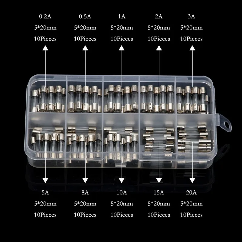 100PCS 5x20mm Quick Blow Glass Tube Fuses 250V 0.2A 0.5A 1A 2A 3A 5A 8A 10A 15A 20A Assorted Kits Fast-blow Glass Fuses Sets