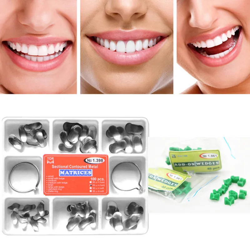 100pcs Dental Matrix kit Sectional Contoured Metal Matrices Plier Matrix Band Forming Clip Silicone add-on Wedges Rubber Dentist