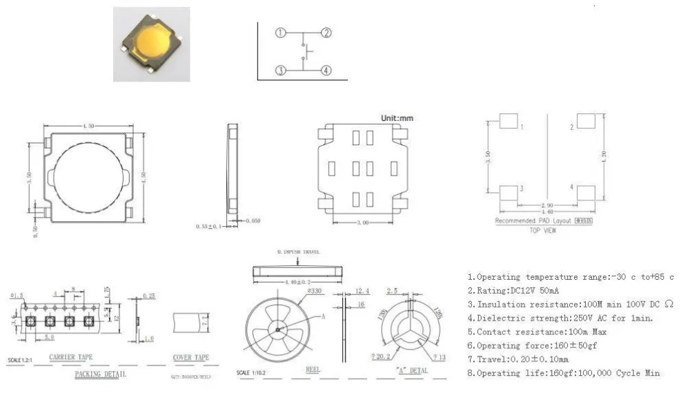 100Pcs 4.5*4.5*0.55mm 4.5x4.5x 0.55MM 4.5X4.5X0.55mm Tactile Push Button Switch Tact 4 Pin Switch Micro Switch SMD