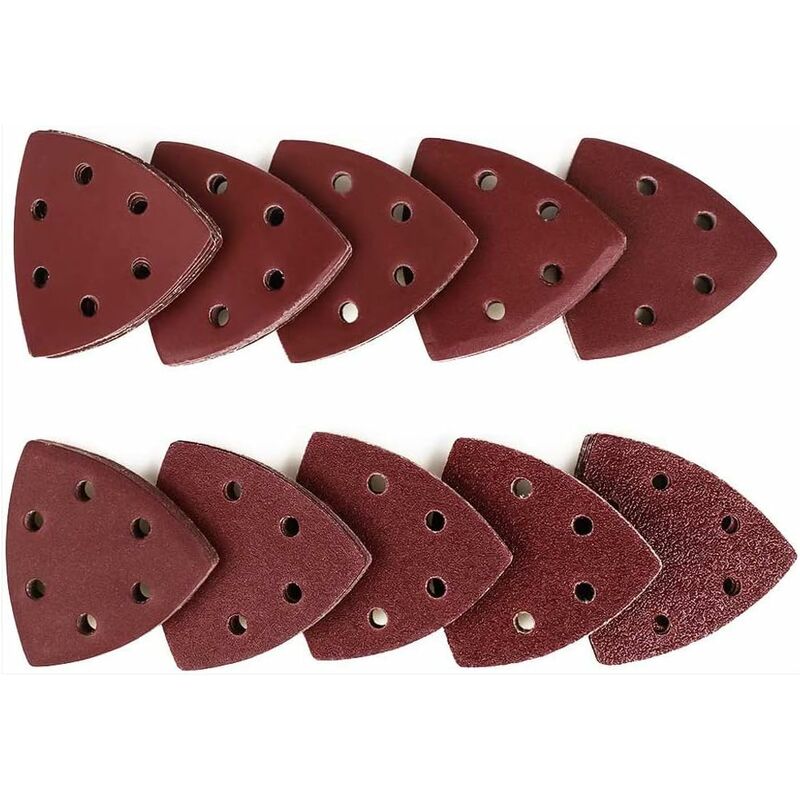 Nota più piccolo è il numero, più ruvido è l'effetto lucidante, più fine è l'effetto lucidante Dimensioni perfette: 90 x 90 x 90 mm, preforate con 6 fori per l'aspirazione della polvere, adatte per levigatrici triangolari da 90 mm. Ampia applicazione: la carta vetrata triangolare è ampiamente utilizzata per rimuovere ruggine, lucidare o levigare oggetti non metallici su superfici metalliche, come plastica, legno, gomma, pelle, vetro, pietra e così via Alta qualità: dimensioni standard, alta qualità, le
