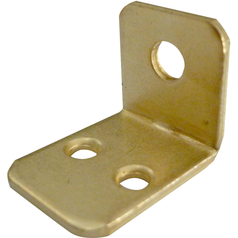 In ferro, spessore 2 mm a 3 fori. foro svasato 4 mm foro tranciato 6,5 mm dimensioni mm 22x28x22 finitura ottonata