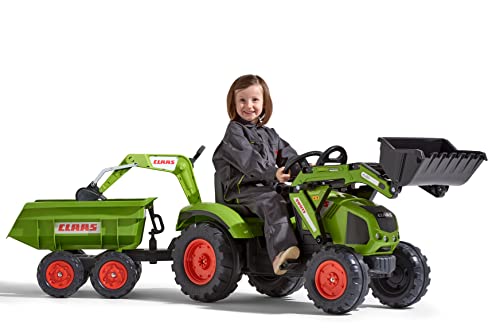 Falk 1010W - Trattorino cavalcabile Modello Claas Axos, con Pala, Scavatrice e rimorchio Maxi GM