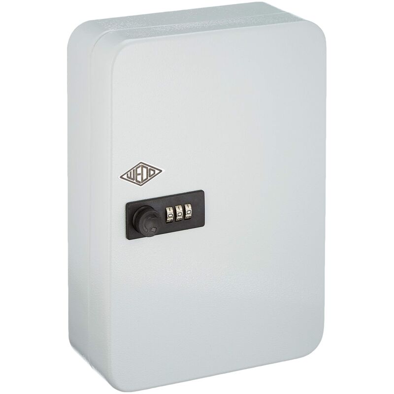 Armadietto chiavi WEDO con lucchetto a combinazione a 3 cifre per 24 chiavi. I compatti armadietti per le chiavi sono corredati di un lucchetto di sicurezza, che è impostabile individualmente con un codice numerico a 3 cifre. Può essere con ciò garantito l'accesso anche ad un maggior numero di utenti ed è possibile correggere/variare il codice in ogni momento, senza che così siano necessarie chiavi. Realizzato in robusta lamiera d'acciaio rivestita a polveri, con resistente superficie opacizzata. Le liste fisse con ganci portachiavi possono essere contrassegnate con le strisce numerate autoadesive in dotazione alla fornitura. Fornitura con istruzioni d'uso e materiale di fissaggio per il montaggio a muro. Colore: grigio chiaro. Dimensioni: 18.6 x 9.4 x 25 cm.