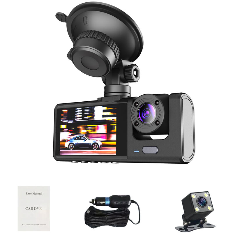 Caratteristiche: Telecamere triple: registratore di guida per auto ad alta nitidezza, tripla fotocamera anteriore + interna + posteriore, lo schermo da 2 pollici mostra immagini in tempo reale per te, rendendo la guida più sicura. Ampia gamma di riprese: supporta un ampio angolo di 140°, nessuna distorsione dell'immagine, un'ampia gamma di riprese. La fotocamera interna supporta la rotazione di 110°, si adatta facilmente all'angolo retto. Video per visione notturna: supporta la funzione di visione notturna, sensore ad alta sensibilità, migliora la qualità dell'immagine, può girare video nitidi anche in condizioni di oscurità o scarsa illuminazione. Registrazione in loop: max. supporta la scheda di memoria 128G (non inclusa), quando il contenuto sulla scheda di memoria raggiunge il limite superiore, il video appena registrato sovrascriverà automaticamente il video più vecchio. Altre funzioni: con un pulsante della fotocamera, può aiutarti a registrare facilmente immagini importanti.