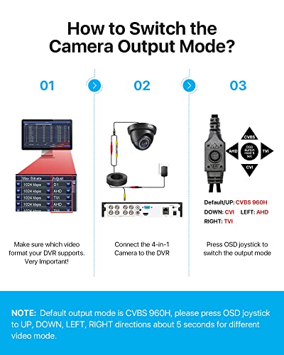 Viene fornito con un menu OSD che può cambiare 4 diverse uscite video. 720P AHD, 720P CVI, 720P TVI e 960H CVBS. La modalità video predefinita è la modalità 960H, compatibile con tutti i DVR analogici. La modalità video 720P deve essere cambiata in base al tipo di DVR 720P. Ampio utilizzo: Con il menu OSD, è possibile cambiare liberamente e rapidamente la modalità del segnale in 5 secondi.