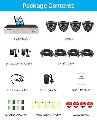 ZOSI 1080p Kit di Telecamera di Sorveglianza, 4x 2,0 MP Telecamera per Esterno, H.265+ DVR 8 Canali con Disco Rigido da 1TB, Rilevamento di Movimento, Avviso tramite App