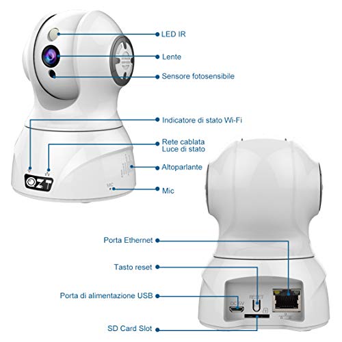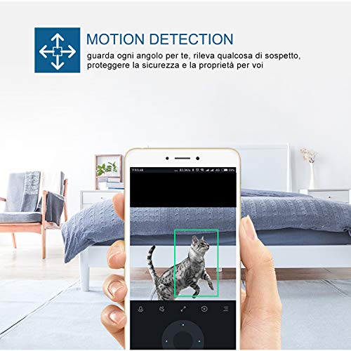 SMART MOTION DETECTION: Gli avvisi di movimento in tempo reale verranno inviati al tuo smartphone e potrai immediatamente avvisare l'invasore con l'altoparlante, la modalità di crociera automatica ispezionerà in modo conveniente l'area, Le immagini / i video verranno salvati automaticamente all'avviso di movimento (per utilizzare questa funzione, devi inserire una scheda TF / micro SD nella fotocamera)