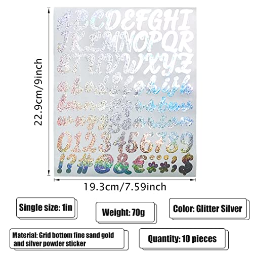 ✿Pacchetto incluso:riceverai 10 fogli di numeri di lettere autoadesive in vinile argento glitterato,inclusi 260 pezzi di lettere maiuscole,340 pezzi di lettere minuscole e 100 pezzi numerici e di punteggiatura, quantità abbondante per soddisfare le tue esigenze di uso quotidiano.