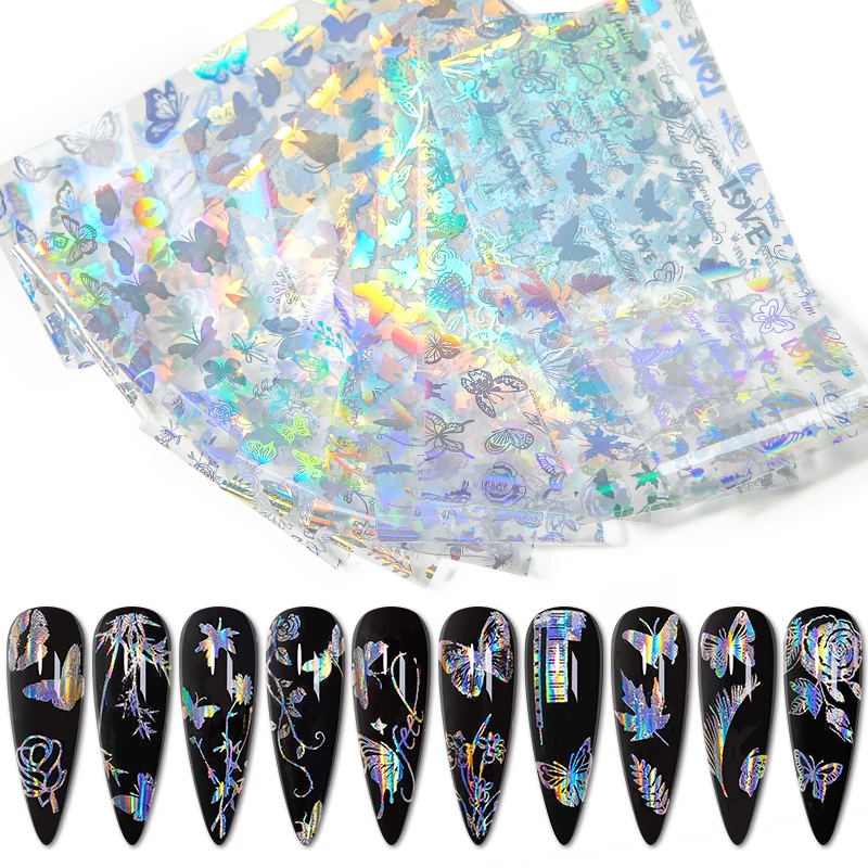 10pcs Holographic Nail Stickers Butterfly Nail Art Transfer Sticker Nail Art Decals Adhesive Wraps Decal Manicure Accessories