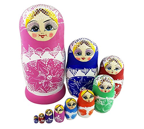 10pcs Lovely Large Russian Nesting Doll Handmade Wooden Dolls, Colorful Porcelain by Winterworm