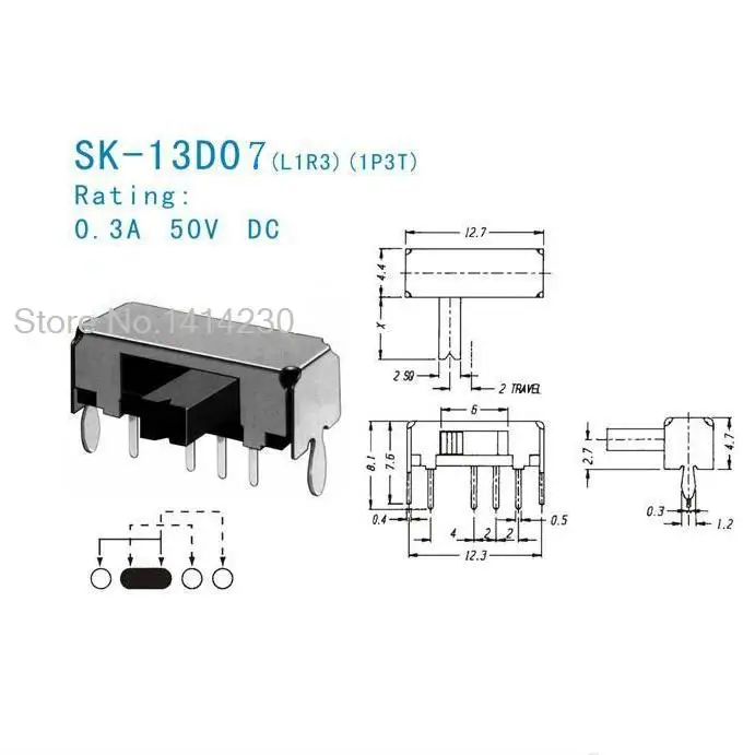 10Pcs SK13D07VG4 DC 50V 0.5A 4 Pin PCB 3 Position SP3T 1P3T Mini Slide Switch Right Angle 4MM handle high