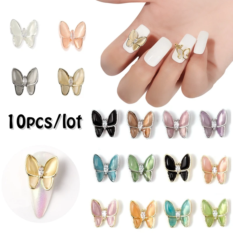 10Pcs/Bag Candy Color Butterfly Nail Jewelry Gold/Silver 3D Solid Cat Eye Stone Butterflies DIY Nail Art Decorations Accessories