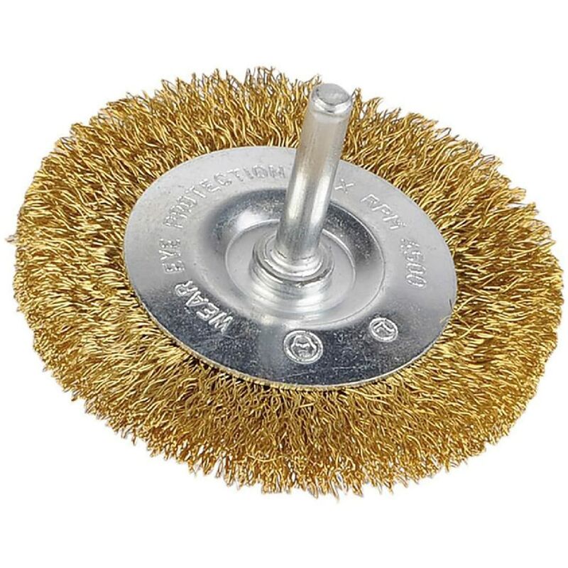 Spazzola circolare con setole in acciaio ondulato e rivestito in ottone. Adatta per la sgrossatura, l'opacizzazione e la sverniciatura. Ideale per l'uso con trapani con codolo da 6 mm.