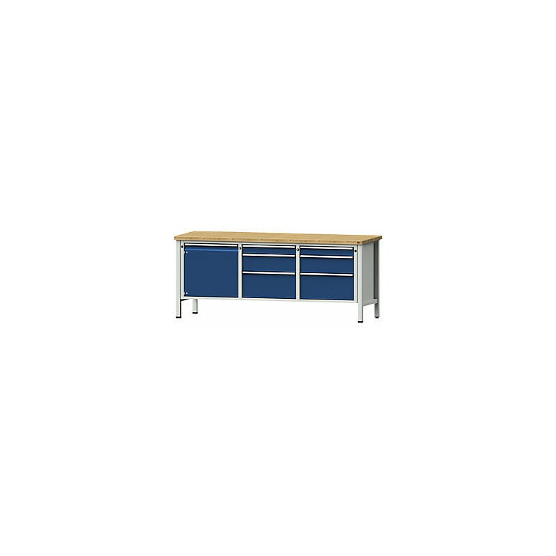 Banco da lavoro, struttura modulare, 1 anta da 540 mm, 6 cassetti, faggio massello, estrazione parziale. Fornitura = montato. Larghezza piano = 2000 mm. Profondità piano = 700 mm. Tipo di piano = piano in faggio massello. Spessore piano = 40 mm. Numero cassetti = 6 pz. Altezza cassetti = 2x90, 2x180, 2x270 mm. Altezza = 840 mm. Altezza di lavoro = 840 mm. Colore corpo = grigio chiaro RAL 7035. Colore frontalino = blu genziana RAL 5010. Versione cassetti = guida a rulli. Portata per cassetto = 100 kg. Estrazione cassetti = 86%. Materiale telaio = acciaio, verniciato a polvere. Numero ante = 1 pz. Altezza porta = 540 mm. Portata statica = 1500 kg. Versione telaio = tubo a sezione quadra 45x45 mm. Colore telaio = grigio chiaro RAL 7035. Serratura = chiusura centralizzata a cilindro con nucleo sostituibile. Larghezza x profondità 2000 x 700 mm. Maniglia in alluminio con targhette. Massima stabilità - componenti del corpo ribattuti fino a 10 volte. Resistente piano di lavoro in listelli di
