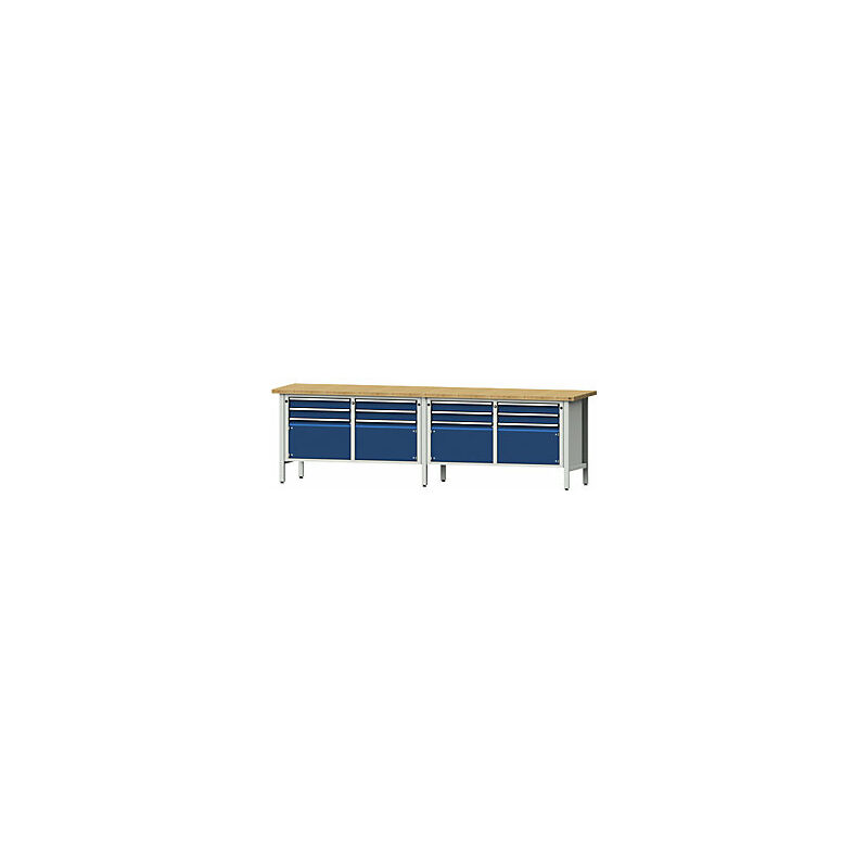 Banco da lavoro con larghezza 2800 mm, struttura modulare, 4 ante, 8 cassetti, piano in faggio massello. Fornitura = montato. Larghezza piano = 2800 mm. Profondità piano = 700 mm. Tipo di piano = piano in faggio massello. Spessore piano = 40 mm. Numero cassetti = 8 pz. Altezza cassetti = 8x90 mm. Altezza = 840 mm. Altezza di lavoro = 840 mm. Colore corpo = grigio chiaro RAL 7035. Colore frontalino = blu genziana RAL 5010. Versione cassetti = guida a rulli. Portata per cassetto = 100 kg. Estrazione cassetti = 86%. Materiale telaio = acciaio, verniciato a polvere. Numero ante = 4 pz. Altezza porta = 4x360 mm. Portata statica = 1500 kg. Versione telaio = tubo a sezione quadra 45x45 mm. Serratura = chiusura centralizzata a cilindro con nucleo sostituibile. Cassetti con estrazione parziale (ca. 86 %). Ingombro ridotto, impiegabili come postazione di lavoro doppia. Massima stabilità - componenti del corpo ribattuti fino a 10 volte. Piani di lavoro di qualità a scelta in legno massello di