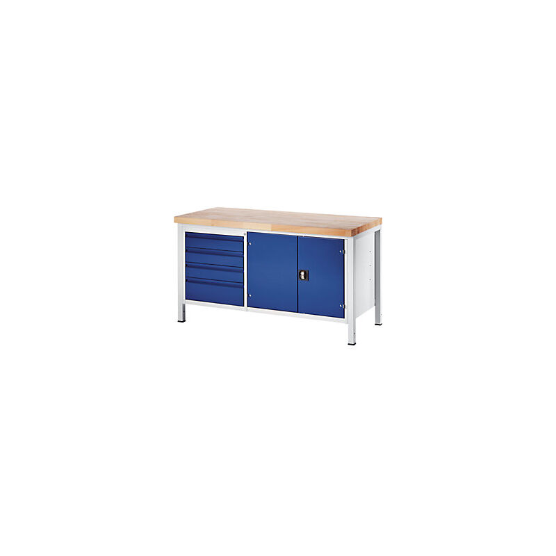 Banco da lavoro, struttura modulare, 4 cassetti dimensione L, 1 armadietto portattrezzi, profondità 700 mm, larghezza 1500 mm. Fornitura = montato. Larghezza piano = 1500 mm. Profondità piano = 700 mm. Tipo di piano = piano in faggio massello. Spessore piano = 40 mm. Numero cassetti = 4 pz. Altezza cassetti = 3x120, 1x180 mm. Altezza = 840 mm. Altezza di lavoro = 840 mm. Colore corpo = grigio chiaro RAL 7035. Colore frontalino = blu genziana RAL 5010. Versione cassetti = guida telescopica su cuscinetti a sfera. Portata per cassetto = 100 kg. Estrazione cassetti = 90%. Larghezza cassetti = 490 mm. Profondità cassetti = 560 mm. Materiale telaio = acciaio, verniciato a polvere. Numero ante = 2 pz. Altezza porta = 580 mm. Portata statica = 1250 kg. Versione telaio = tubo a sezione quadra 45x45 mm. Colore telaio = grigio chiaro RAL 7035. Serratura = chiusura centralizzata a cilindro. Numero ripiani = 1 pz. Superficie di lavoro con grande portata grazie al telaio di supporto sotto al piano.