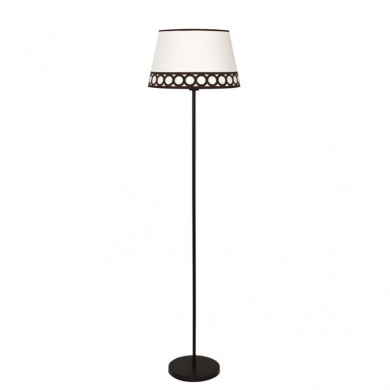 Lampada da terra serie Dalia in colore beige/marrone. È realizzato in metallo e materiale tessile, con bordo decorativo con motivi circolari. La famiglia può essere completata con la lampada a sospensione, da tavolo e a tre e due luci. Ha un portalampada E27.