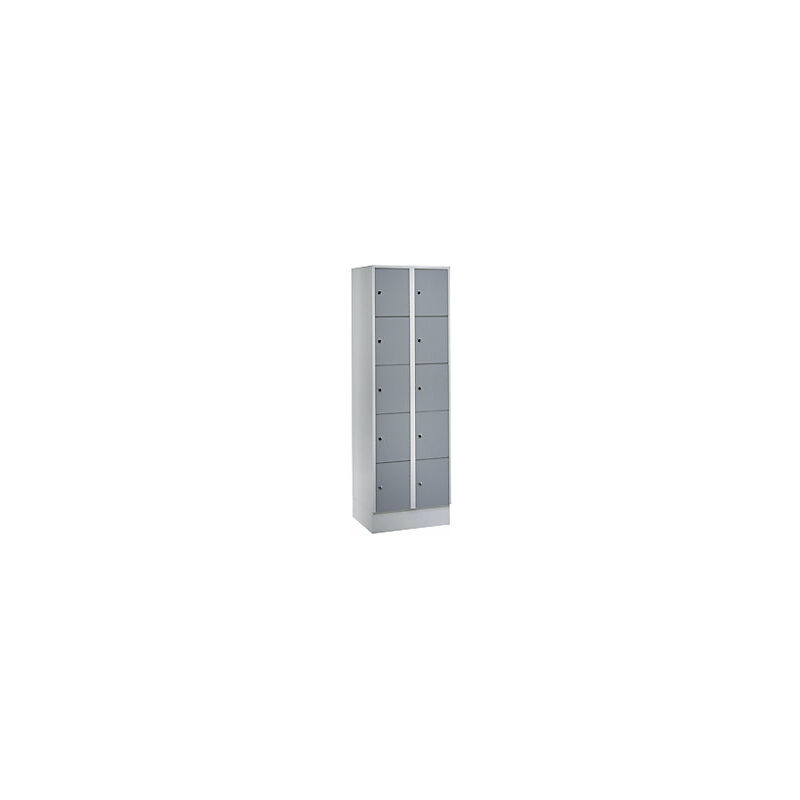 Armadio a scomparti con serratura, con zoccolino, 10 scomparti, 300 mm, grigio chiaro / grigio argento. Fornitura = montato. Altezza = 1800 mm. Profondità = 500 mm. Larghezza = 600 mm. Colore corpo = grigio chiaro RAL 7035. Colore porta = grigio argento RAL 7001. Serratura = serratura a cilindro di sicurezza differenziata. Numero scomparti in larghezza = 2 pz. Numero scomparti = 10 pz. Larghezza scomparti = 300 mm. Materiale = lamiera d'acciaio saldata. Altezza armadietto = 1800 mm. Dotazione interna = senza dotazione interna. Larghezza interna = 298 mm. Altezza interna = 300 mm. Profondità interna = 475 mm. Tipo di porta = ante piene. Numero chiavi = 2 pz. Altezza scomparti = 320 mm. Larghezza ripiani = 300 mm. Profondità ripiani = 500 mm. Altezza zoccolo = 100 mm. Struttura = saldata. Superficie = con verniciatura a forno. Sfruttamento ottimale dello spazio grazie agli armadietti sovrapposti (vedi Accessori). Con serratura a cilindro. In lamiera d'acciaio saldata. Corpo sempre in