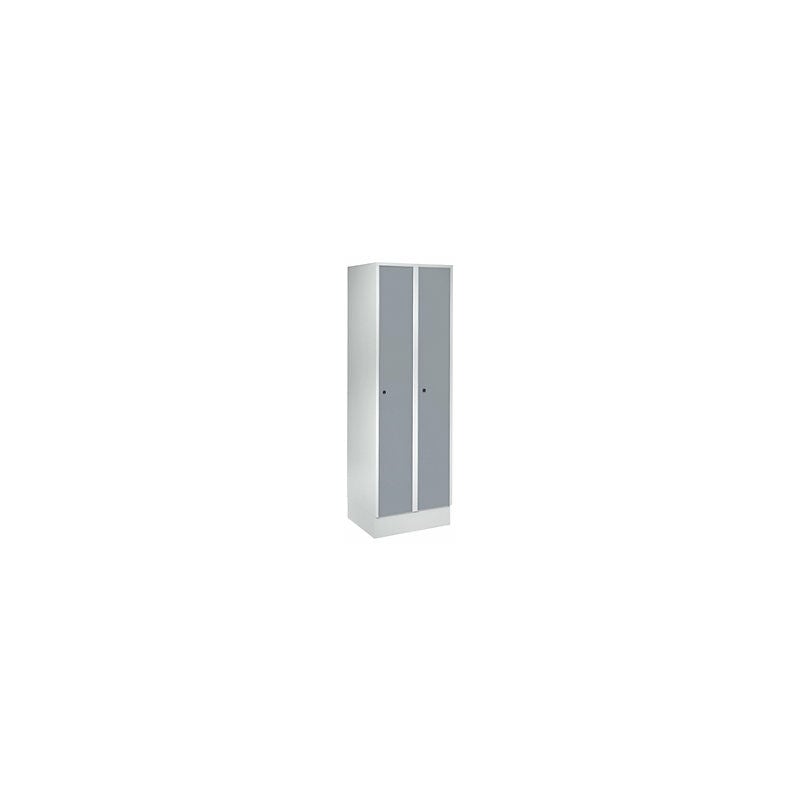 Armadietto guardaroba con zoccolino, alt. x largh. x prof. 1800 x 600 x 500 mm, 2 scomparti, grigio argento. Fornitura = montato. Altezza = 1800 mm. Profondità = 500 mm. Larghezza = 600 mm. Colore corpo = grigio chiaro RAL 7035. Colore porta = grigio argento RAL 7001. Serratura = serratura a cilindro di sicurezza differenziata. Numero scomparti in larghezza = 2 pz. Larghezza scomparti = 300 mm. Materiale = lamiera d'acciaio saldata. Altezza armadietto = 1800 mm. Dotazione interna = 1 cappelliera, 1 asta appendiabiti con 3 ganci scorrevoli. Larghezza interna = 298 mm. Altezza interna = 250 / 1400 mm. Profondità interna = 475 mm. Tipo di porta = ante piene. Numero chiavi = 2 pz. Altezza zoccolo = 100 mm. Altezza piedini = 150 mm. Struttura = saldata a punti. Superficie = con verniciatura a forno. Sfruttamento ottimale dello spazio grazie agli armadietti sovrapponibili. Con serratura a cilindro. Varianti di dotazione in base alle esigenze. In lamiera d'acciaio saldata. Corpo sempre in