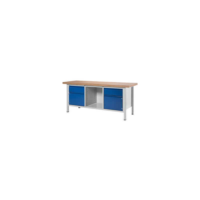 Banco da lavoro, struttura modulare, 2 cassetti, 2 ante, 1 scomparto aperto, larghezza ripiano 2000 mm, blu genziana. Fornitura = montato. Larghezza piano = 2000 mm. Profondità piano = 700 mm. Tipo di piano = faggio massello con impiallacciatura di copertura. Spessore piano = 40 mm. Numero cassetti = 2 pz. Altezza cassetti = 2x180 mm. Altezza = 840 mm. Altezza di lavoro = 840 mm. Colore corpo = grigio chiaro RAL 7035. Colore frontalino = blu genziana RAL 5010. Versione cassetti = supporto rulli. Portata per cassetto = 100 kg. Estrazione cassetti = 90%. Materiale telaio = acciaio, verniciato a polvere. Numero ante = 2 pz. Altezza porta = 2x360 mm. Portata statica = 1250 kg. Versione telaio = tubo a sezione quadra 45x45 mm. Colore telaio = grigio chiaro RAL 7035. Serratura = chiusura centralizzata a cilindro. Robusta e durevole qualità professionale. Cassetti con portata elevata su guide a rulli. Consegnati montati e pronti all'uso. Numerosi accessori disponibili - ampliabile per un