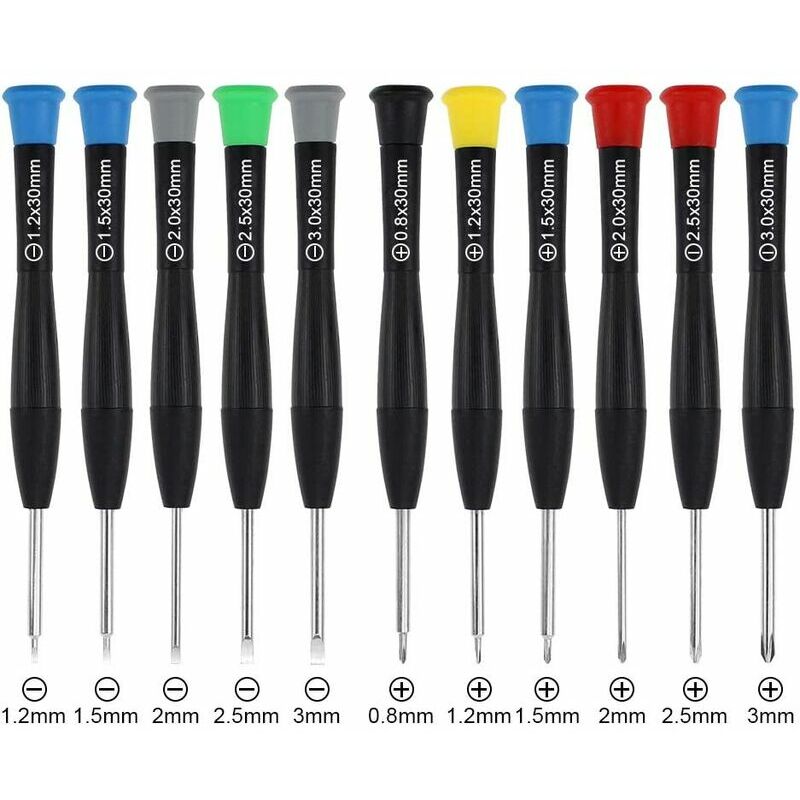 Dimensioni: cacciavite Phillips 0,8 mm/1,2 mm/1,5 mm/2,0 mm/2,5 mm/3 mm, cacciavite a testa piatta 1,2 mm/1,5 mm/2,0 mm/2,5 mm/3,0 mm. Design antiscivolo: la parte dell'impugnatura adotta un design a strisce, il design antiscivolo e con cuscinetti a sfera può ruotare facilmente di 360 gradi. Punta standard: la punta è realizzata in lega di acciaio al cromo-vanadio ed è magnetica, includiamo anche 5 magneti per un facile fissaggio delle viti. Segno del simbolo: la superficie del cacciavite è contrassegnata con il numero del modello, puoi trovare rapidamente lo strumento che desideri. Ampiamente usato: adatto per riparare piccoli prodotti elettronici come occhiali da sole, occhiali, computer, laptop, orologi, ecc.