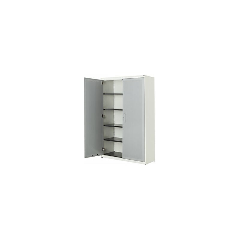 Armadio con ante a battente, con efficace assorbimento acustico, alt. x largh. x prof. 1956 x 1200 x 432 mm, 4 ripiani, bianco puro / alluminio brillante. Fornitura = montato. Larghezza = 1200 mm. Altezza = 1956 mm. Profondità = 432 mm. Colore corpo = bianco puro RAL 9010. Materiale = acciaio, verniciato a polvere. Tipo di prodotto = armadi con ante a battente. Tipo di porta = anta a battente. Colore porta = alluminio brillante RAL 9006. Numero ante = 2 pz. Numero ripiani = 4 pz. Materiale ripiani = acciaio, verniciato a polvere. Colore ripiani = nero grafite RAL 9011. Portata per ripiano = 66 kg. Caratteristiche = con serratura. Serratura = serratura a cilindro girevole con chiusura a triplo chiavistello, 2 chiavi incluse. Numero file raccoglitori = 5 pz. Dotazione interna = 4 ripiani. Angolo di apertura delle porte = 120 °. Semplice spazio per raccoglitori, documenti e materiale da ufficio. Il modello classico tra gli armadi archivio. Design minimalista. Funzionalità pratica. Robusto