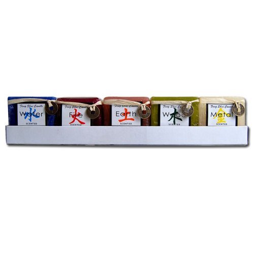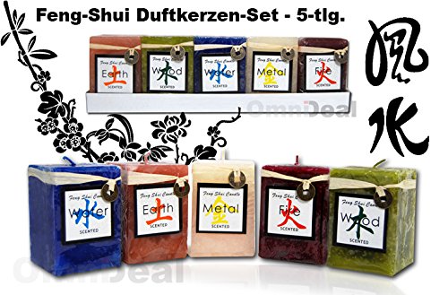 12120 - Set 5 Pezzi Candele profumate Feng-Shui, 5 monetine Portafortuna Cinesi Incluse, Dimensioni ca. 5 x 5 x 5 cm