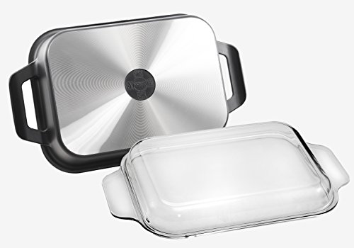 Caratteristiche: spessore del fondo di 5 mm, spessore del bordo di 2,3 mm, rostiera utilizzabile in forno fino a 260°C, coperchio in vetro utilizzabile in forno fino a 180°C, adatta a tutti i piani cottura (eccetto quelli a induzione), lavabile in lavastoviglie, incl. griglia