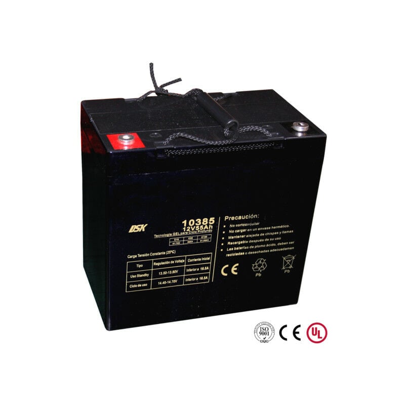 Batteria 12Vdc 55Ah GEL a ciclo profondo SOLAR DSK LEAD 12Vdc Tipo di batteria GEL a ciclo profondo Tensione 12V Capacità 55 Ah Energia 0,7 kWh Dimensioni 229 x 138 x 208 x 212 mm Terminale M6 Vita stimata (25°C) Da 12 a 15 anni Corrente di scarica max. Corrente di scarica (25°C) 500A (5s) Autoscarica (25°C al mese) 3% Autoscarica (25°C al mese) 3% Resistenza interna (piena carica a 25°C) Resistenza interna (piena carica a 25°C) Circa 10,0mΩ Tensione di carica (25°C) Uso ciclico 14,4-14,7V Tensione di carico (25°C) Uso fluttuante/Standby 13,6-13,8V Corrente massima 12,40A Capacità influenzata dalla temperatura a 40°C 102% Capacità influenzata dalla temperatura a 25°C Capacità influenzata dalla temperatura a 25 °C 100% Capacità influenzata dalla temperatura a 0°C 90% Capacità influenzata dalla temperatura a -15°C 70% Capacità influenzata dalla temperatura a -15°C 70% Capacità influenzata dalla temperatura a -15°C 70% Capacità influenzata dalla temperatura a -15°C Peso 16,8 kg
