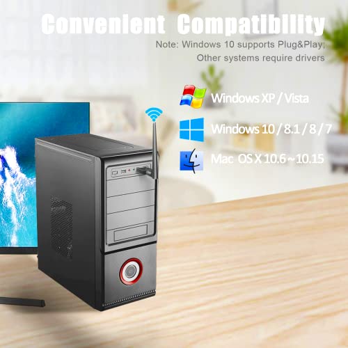 Antenna WiFi ad alto guadagno 5dBi USB a lungo raggio: il nostro adattatore di rete wireless USB è dotato di antenna WiFi ad alto guadagno staccabile da 5dBi che può essere ruotata di 360°, rendendo la scheda di rete wireless per laptop più facile da ricevere segnali WiFi. Migliorerà notevolmente la potenza del segnale di ricezione e trasmissione dell'adattatore WiFi wireless se si ruota l'antenna dell'adattatore WiFi desktop. Consente all'adattatore wireless per computer desktop di fornire un'eccellente stabilità e fluidità