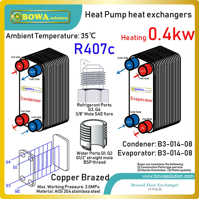 1400BTU heat pump water heater‘s plate heat exchangers move heat from low level to high level by compressor force driving