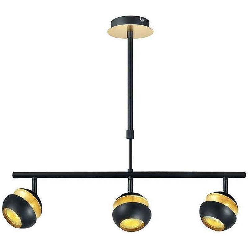 Sospensione con tre faretti della serie BEETHOVEN in colore NERO/ORO. Realizzato in metallo con tre portalampada GU10. Lampadine non incluse. Design moderno e originale con faretti tondi e articolati verticalmente, con una rotazione orizzontale di quasi 360°, permettendo così di orientare i punti luce verso qualsiasi zona della stanza. Le sue dimensioni sono regolabili in altezza da 44 & lt, 68X56.5X12 centimetri. Modello disponibile anche in bianco/argento. La collezione può essere completata con la versione a sospensione a quattro luci, striscia a quattro luci, striscia a tre luci, striscia a due luci, plafoniera a tre luci e lampadina a una luce.