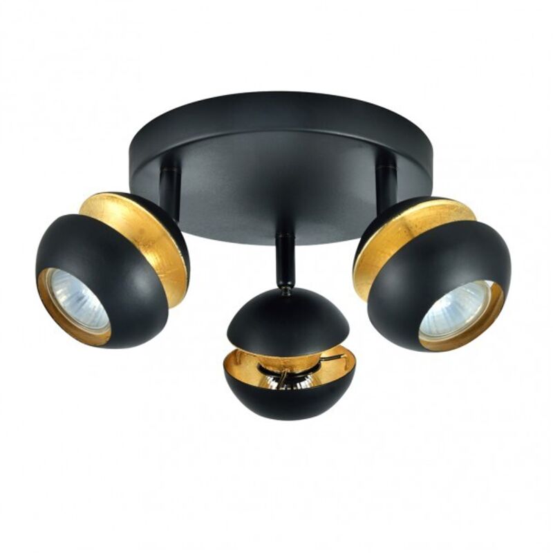 Lampada da soffitto a tre faretti della serie BEETHOVEN di colore NERO/ORO. Realizzato in metallo con tre portalampada GU10. Lampadine non incluse. Design moderno e originale con faretti tondi e articolati verticalmente, con una rotazione orizzontale di quasi 360°, permettendo così di orientare i punti luce verso qualsiasi zona della stanza. Le sue dimensioni sono 14X22X22 centimetri. Modello disponibile anche in bianco/argento, sia nella sua versione con striscia a quattro luci, striscia a tre luci, striscia a due luci, tre e quattro luci pendenti e in una sola lampadina.