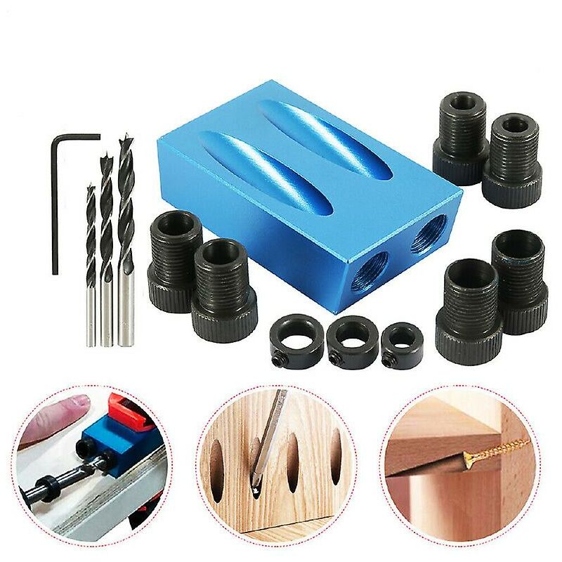 Specifica: Tipo di prodotto: Trapano per fori tascabili Materiale: acciaio al carbonio Materiale anello: acciaio al carbonio Materiale del posizionatore: alluminio Colore principale: blu + nero Dimensioni del posizionatore: ca. 63 * 38 * 18 mm Diametro punta: 6 mm, 8 mm, 10 mm Dimensioni tappo: 6 mm, 8 mm, 10 mm Dimensioni manica: 6 mm, 8 mm, 10 mm Angolo: 15 gradi Quantità: 14 pezzi/set Caratteristiche: UTENSILI DURO: Il set di guide di perforazione per fori tascabili è una straordinaria maschera per la lavorazione del legno e una collezione di utensili eccezionalmente maneggevole. LEGA DI ALLUMINIO: la guida del trapano è realizzata in lega di alluminio di alta qualità per una maggiore durata e una lunga durata. FACILE DA INSTALLARE: dotato di una struttura semplice, il localizzatore di fori inclinati è facile da usare e installare, adatto per unire tavole di legno. 14 PEZZI: La confezione contiene 14 strumenti, tra cui guida per trapano, punte elicoidali, tappi, manicotti e chiave